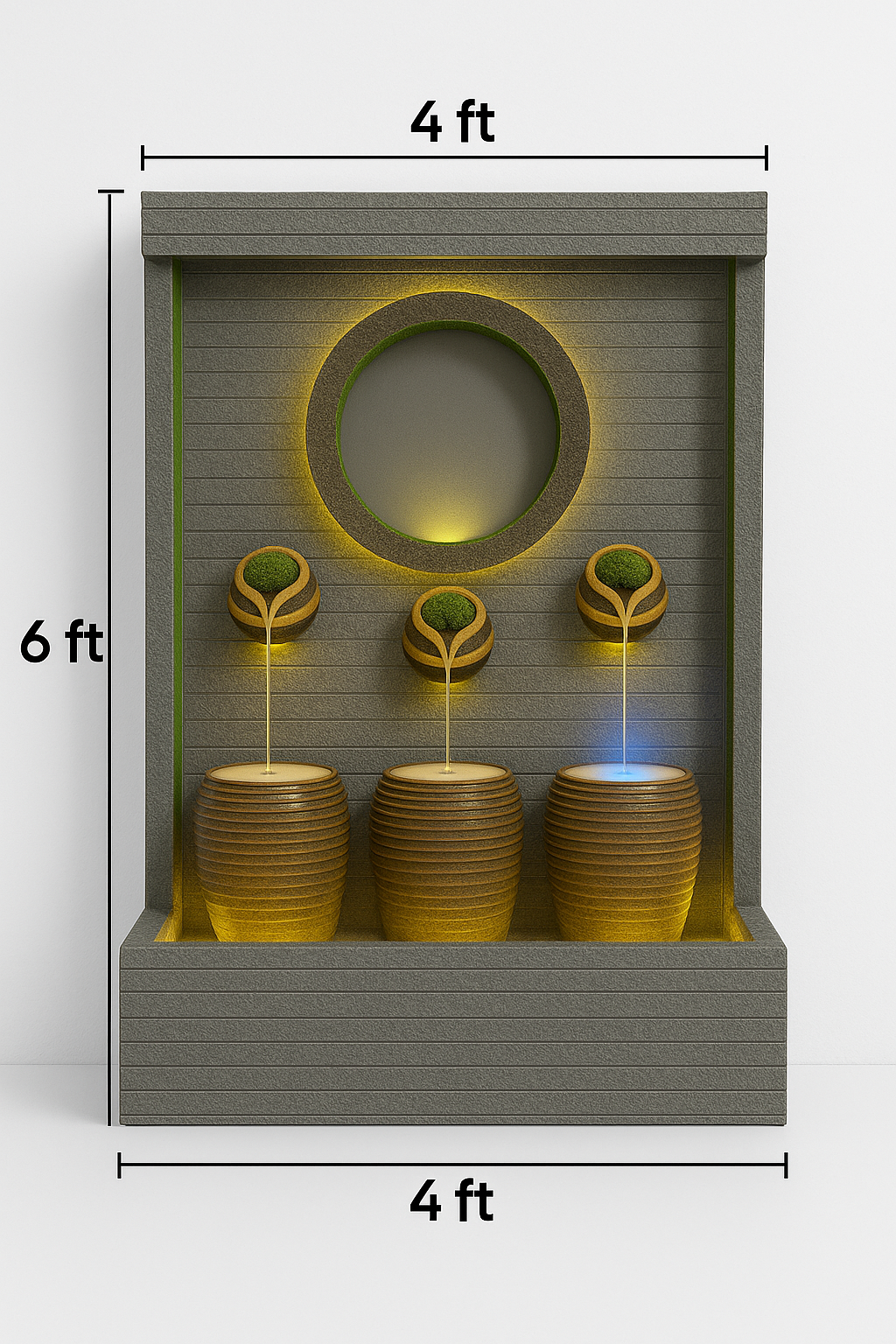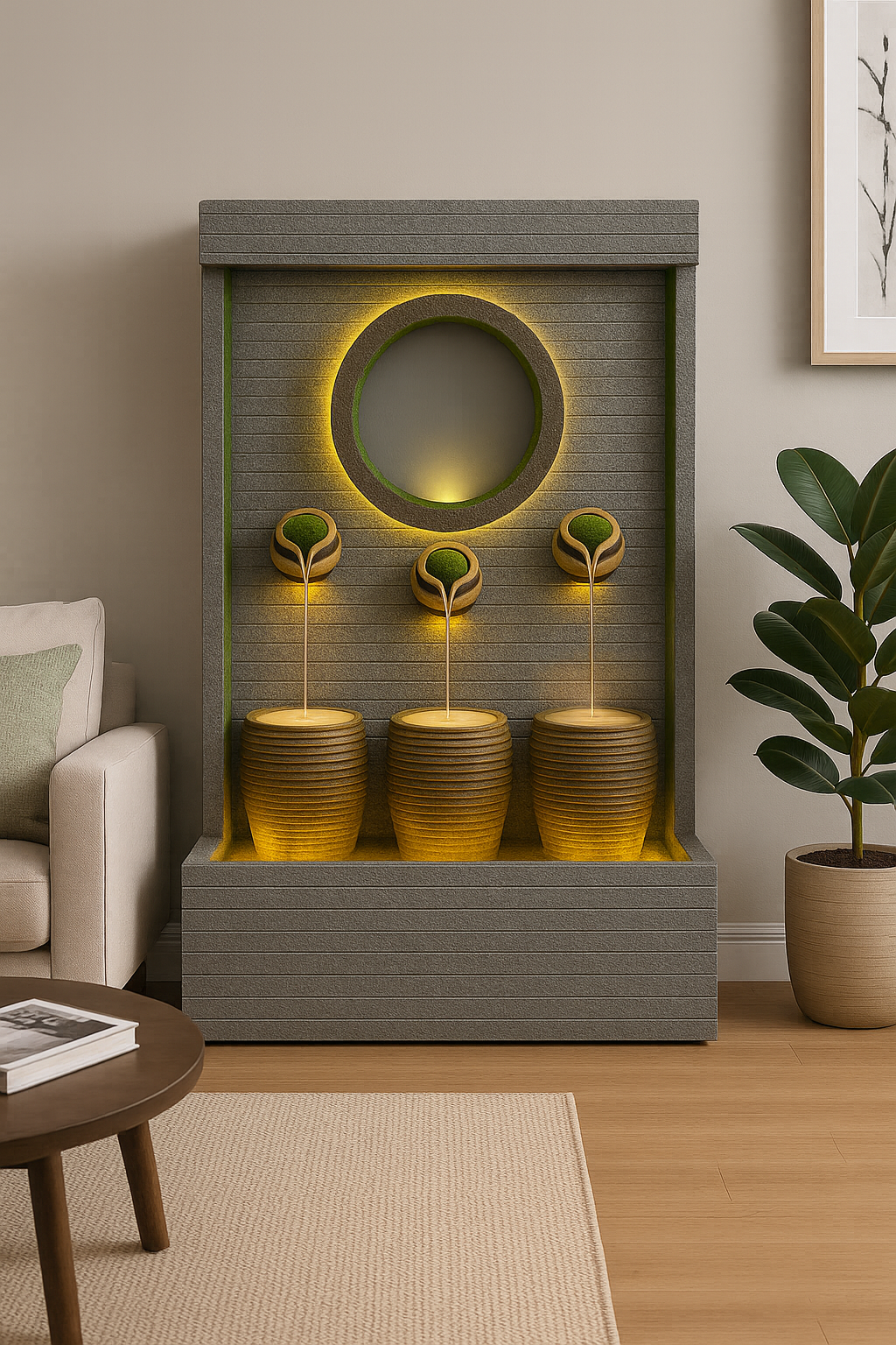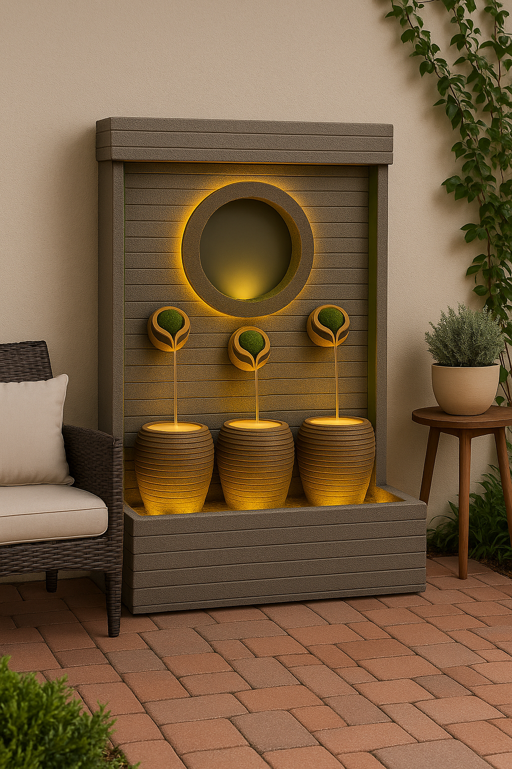 The circular backdrop adds a touch of sophistication, glowing softly to enhance the calming ambience. Perfectly sized for both indoor and outdoor settings, the TrioGlow Cascade Fountain blends effortlessly with modern décor, making it a standout piece for living rooms, offices, patios, or meditation corners.